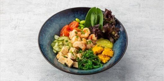 Рис, тунец, авокадо, маринованный огурец, чука, маринованный дайкон, нори, бобы эдамаме, азиатско-кунжутный соус и соус спайси, кунжут, зеленый лук, кинза и лайм