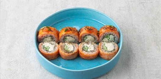 Нори, рис, сыр сливочный, авокадо, икра масаго, лосось, угорь, кунжут, кунжутный соус, майонез